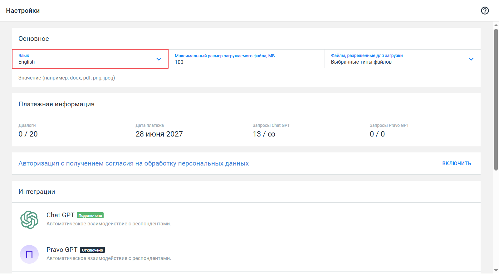 - Выберите язык в блоке Основное. Доступные варианты: