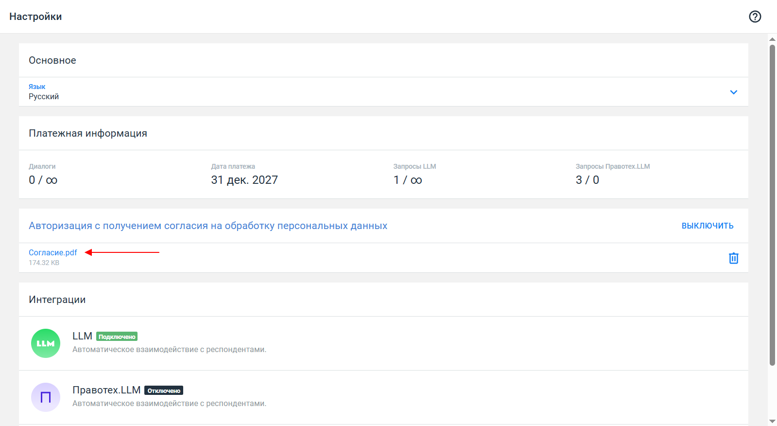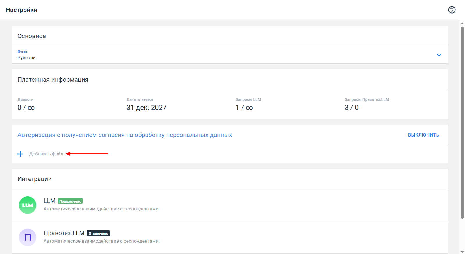 Внимание! Можно добавить только один файл. При отключении настройки Авторизация с получением согласия на обработку персональных данных файл не удаляется из системы и отображается в поле при повторном включении.
