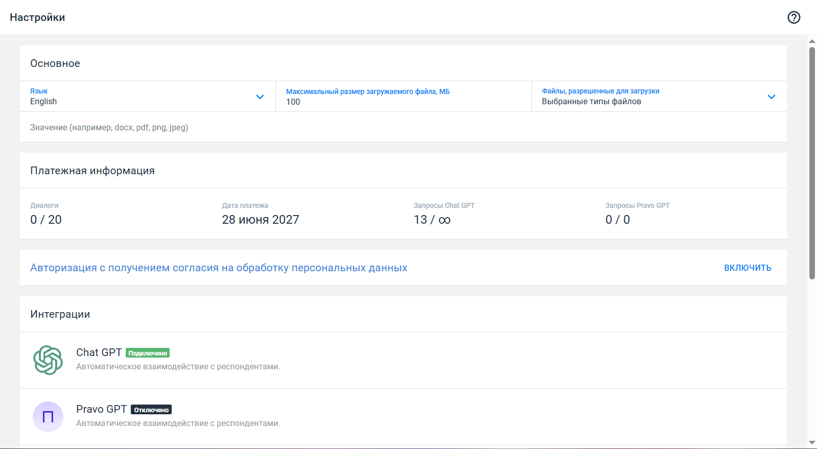 В разделе Настройки вы можете настроить подключение к другим системам и сервисам, чтобы сделать работу Bot.one более эффективной.