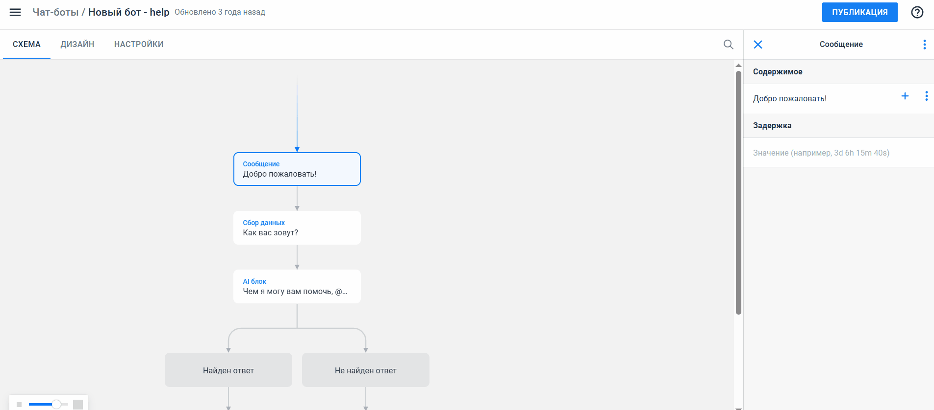 Чтобы не искать контент и не заменять его вручную, пользователи могут выполнить быстрый поиск и замену определенного контента на схеме бота или бота-шаблона. Для этого в меню-троеточии поисковой строки необходимо выбрать значение "Найти и заменить", ввести старое и новое значения в соответствующие поля и нажать Заменить/Заменить всё.