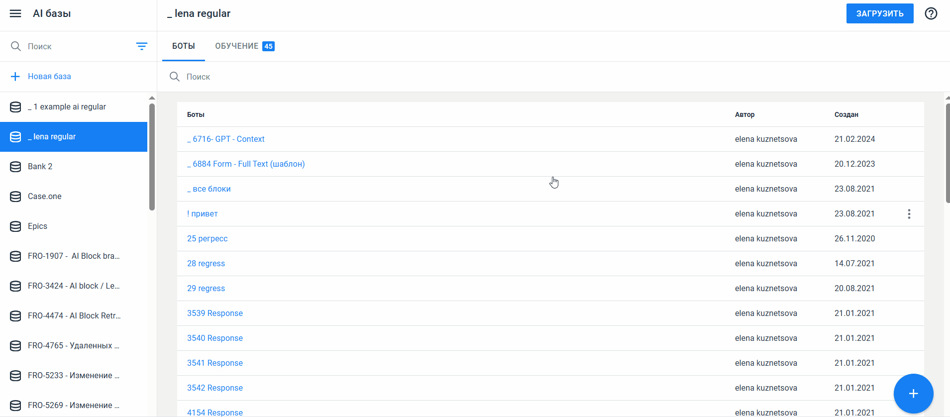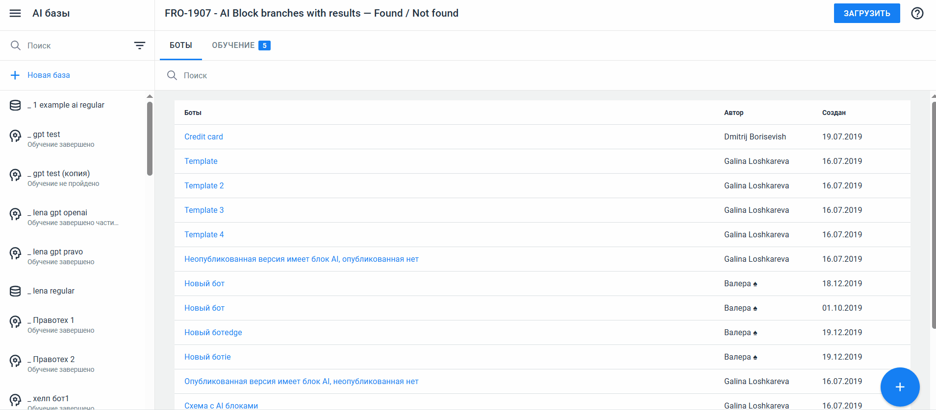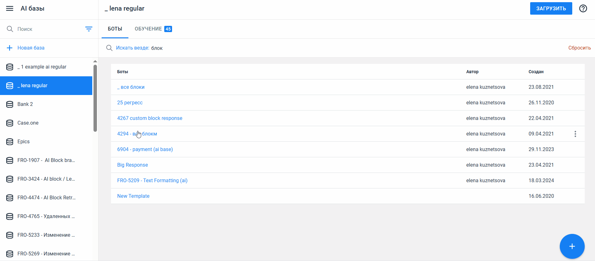 - "Искать везде" - поиск будет выполнен и по названию, и по наполнению (информации внутри всех блоков всех ботов-шаблонов). Найденный контент будет подсвечиваться.