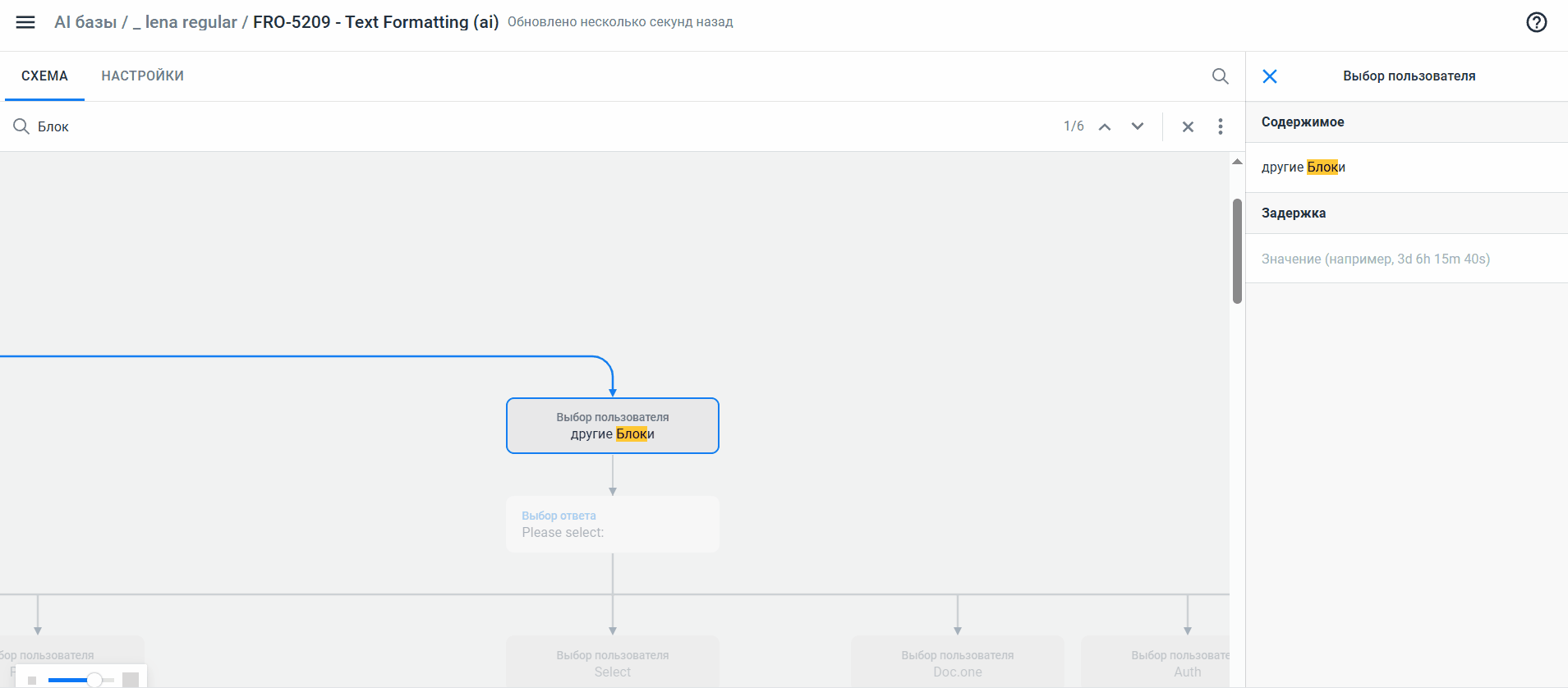 Если в боте-шаблоне искомый контент присутствует более чем в одном блоке, количество совпадений отображается в строке поиска и доступен быстрый переход к ним с помощью кнопок .